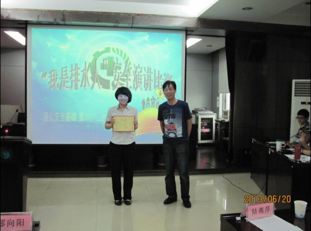 參賽選手在講的同時以PPT為背景為大家展示演講內容,觀點鮮明,立意深刻,語言表達自然流暢,本次比賽結合“我是排水人”主題教育,以“強化安全基礎、推動安全發展”為線索,體現了排水人積極向上的精神風貌。最后來自柯海分公司的林佳獲得第一名,由鄭書記親自頒獎。