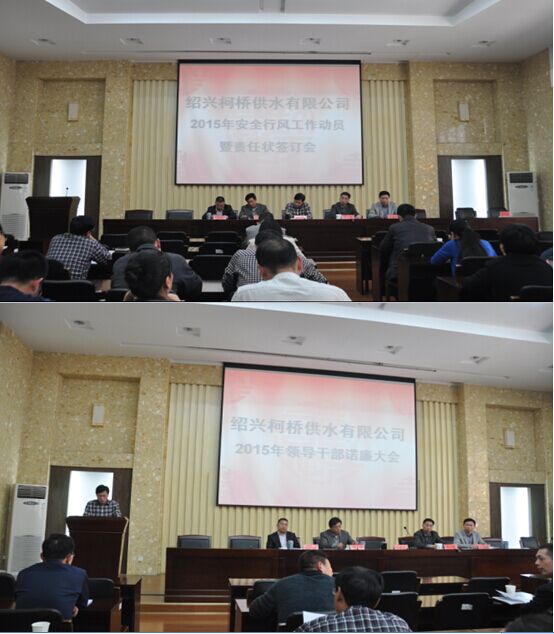 會上,公司領導班子成員及供水分公司經理分別諾廉;安全生產分管副總就2015年安全、行風工作進行了動員部署;公司總經理李葉茂與14個部門(單位)簽訂了2015年度安全、行風生產責任狀。